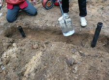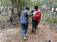 Нам же необходимо было привести территорию могилы в полный порядок. Приступая к работе, мы первым делом вкручиваем определяющие фундамент сваи.