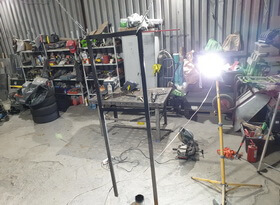 Переходим к следующему этапу – изготовлению опоры. Из прямоугольных профильных труб нарезаем полосы необходимой длины так, чтобы в итоге из них можно было собрать «рамку на ножках».